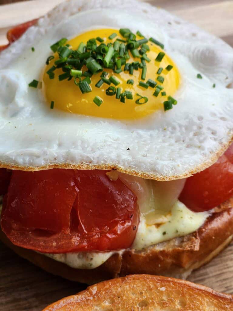 Enjoy white cheddar, pesto mayo, a fried egg, and oven-roasted tomato all on toasted bread.