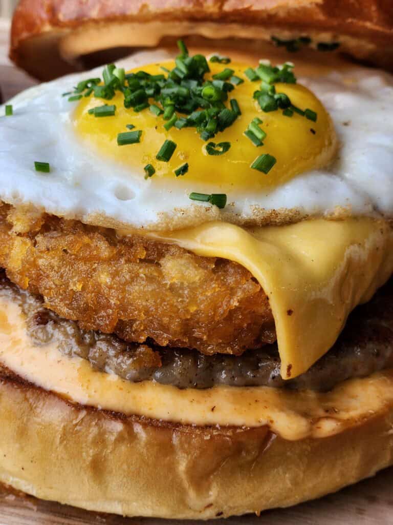 Bite into our juicy smashed patty, crispy hash brown, and a fried egg, all nestled between a Sodo roll, smothered with melty American cheese and our spicy mayo.