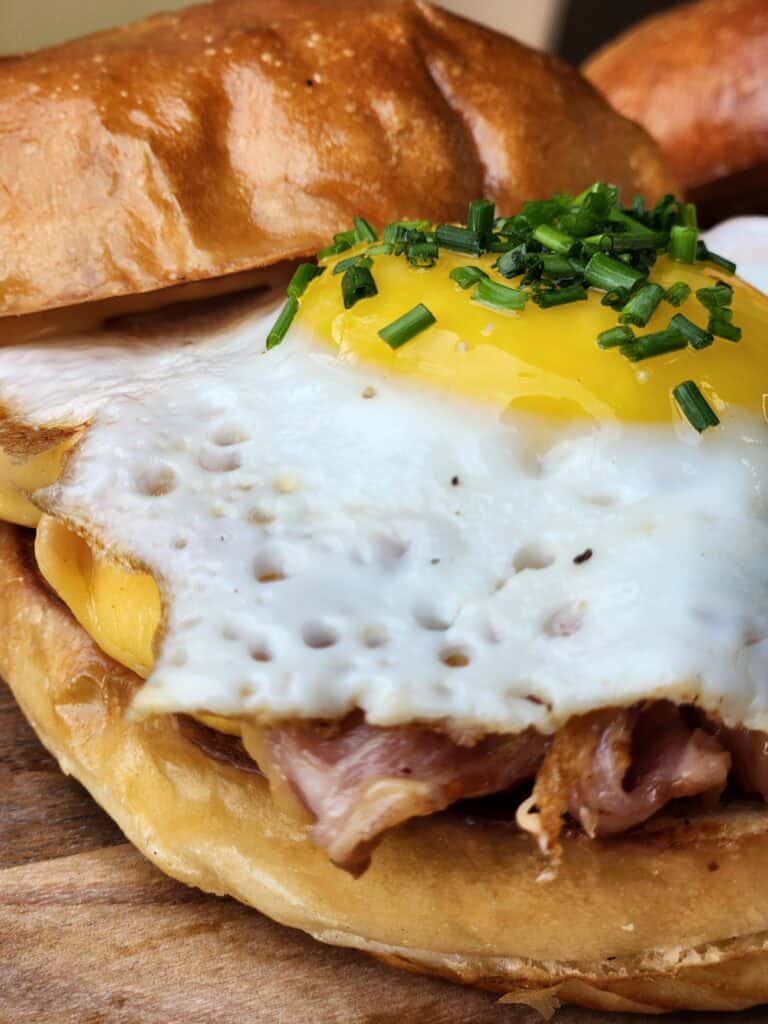 Our ham, egg and cheese is between a Sodo roll piled high with smoky Jack Mountain ham, a fried egg, American cheese, and a kick of spicy mayo.